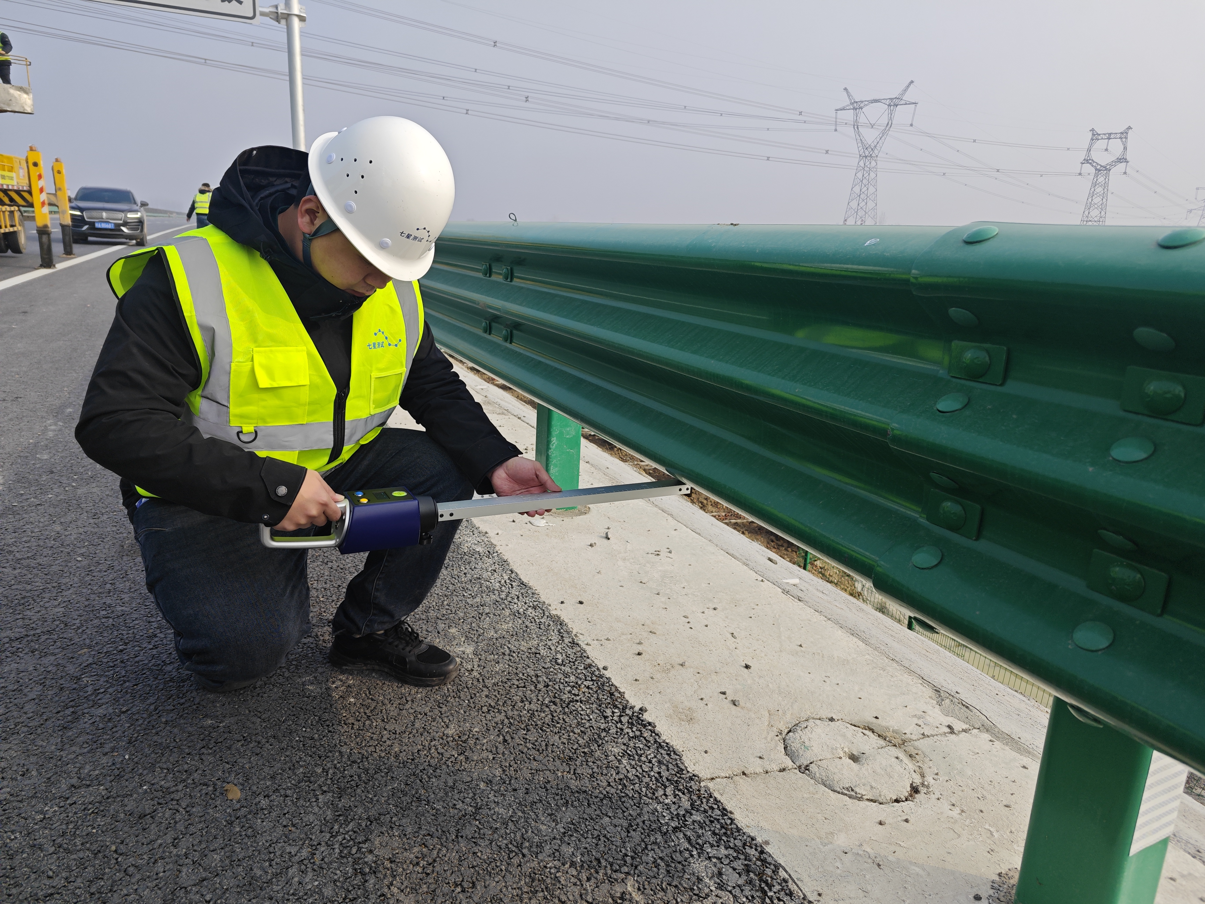 公路波形梁护栏中心高度智能检测装置外业操作场景